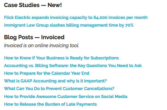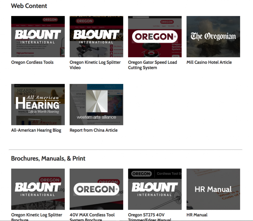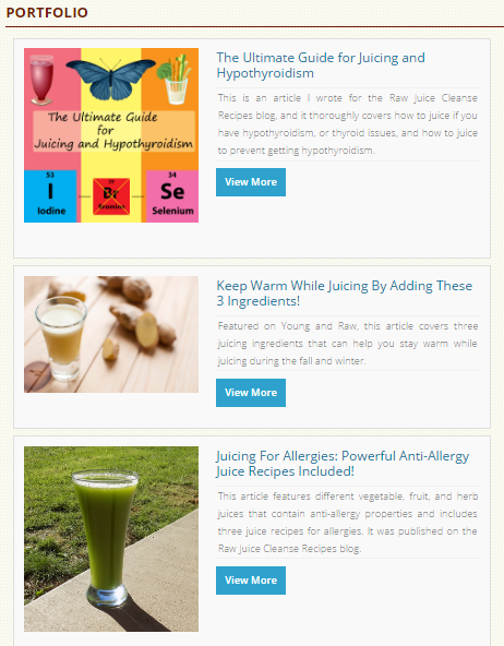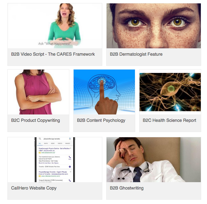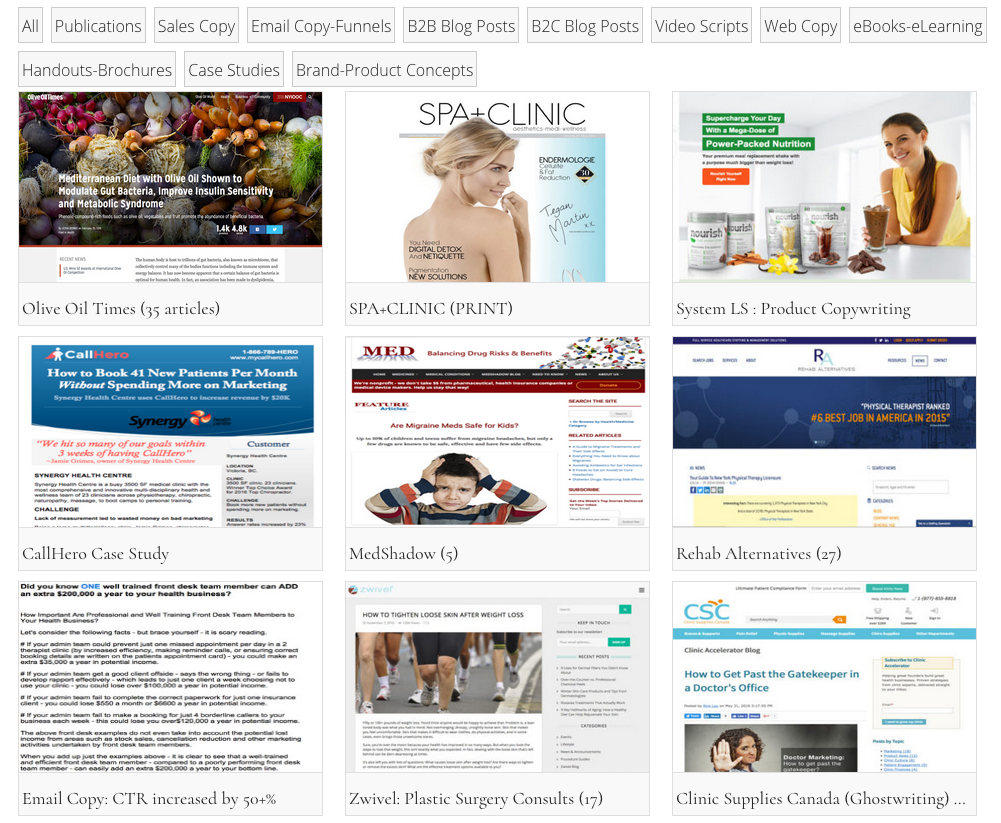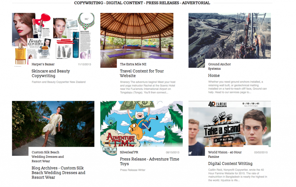 The majority of portfolios I’ve seen are laid out in a long list of samples. In terms of portfolio layouts, lists can work if they are organized, neat and tidy. (While it’s not essential, adding visual elements to your writing portfolio will make you more appealing to prospects and clients.) Here’s an example of a list-style portfolio: