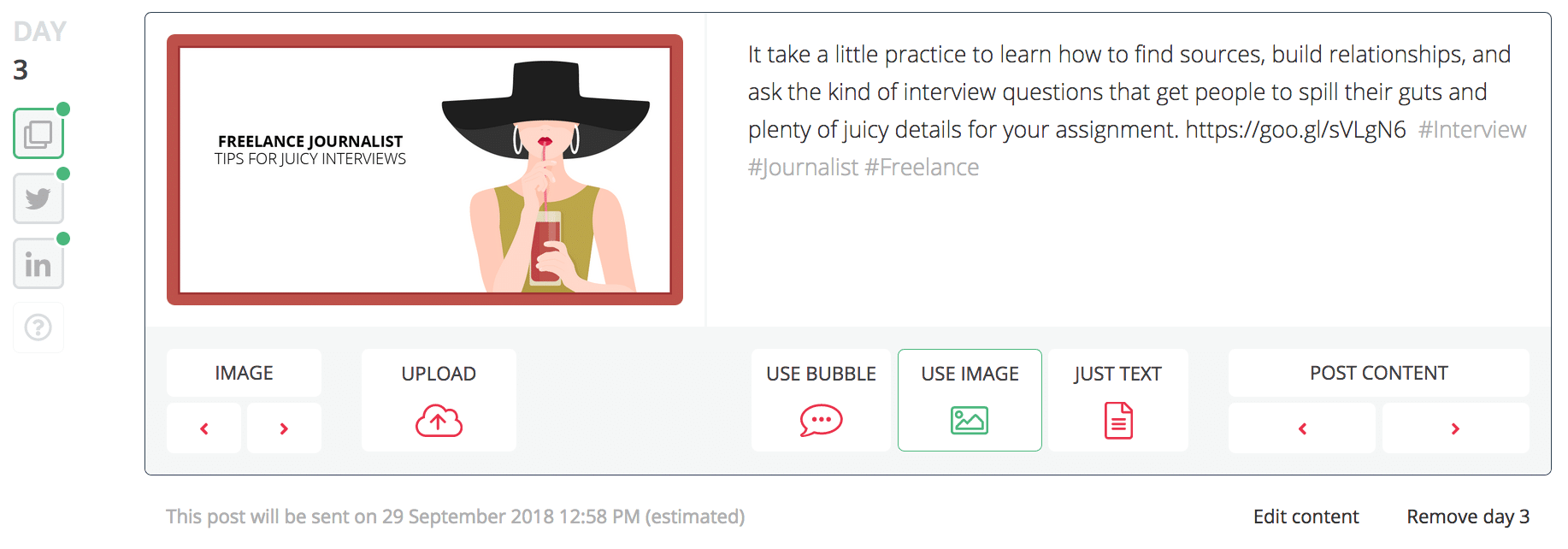 I like Hootsuite for this. Besides easily writing and scheduling posts across multiple social platforms, Hootsuite lets you easily grab items to reshare from your newsfeeds (because your posts shouldn’t all be about your client, right?). Like many of the tools mentioned here that have a paid level, you can get started with a free account.